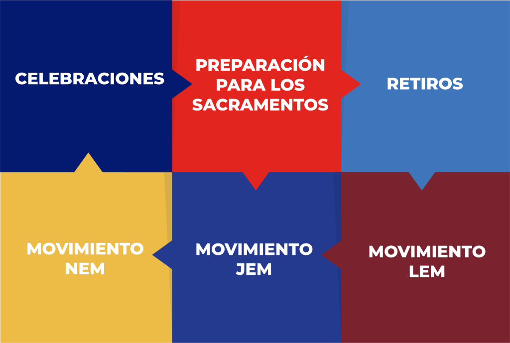 Incluye liturgias, oraciones, convivencias, retiros, voluntariado, y actividades sociales (solidaridad y justicia).