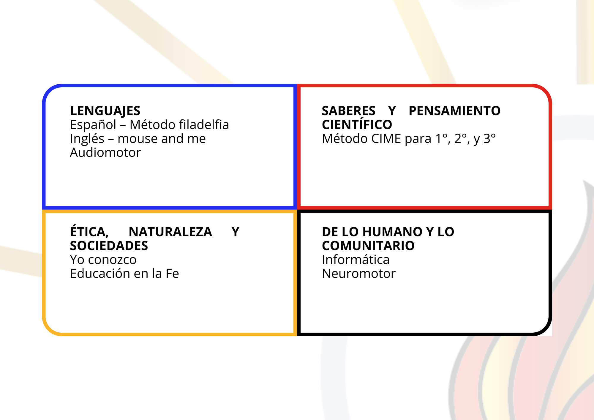 Además de las materias curriculares, ofrecemos Educación en la Fe, un programa de valores, Inglés, el método CIME para fortalecer el pensamiento matemático, así como clases de informática. Así como experiencias que fortalecen el aprendizaje integral de los alumnos de acuerdo a su edad y intereses.